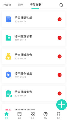 首页:包括数据仪表盘、日程提醒、待我审批提醒、快捷操作入口