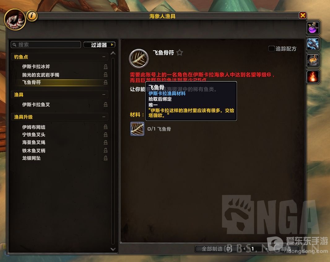 (1)作用:解锁高地垂钓鱼点及高地特别鱼群:棱光跃鲑鱼群。(2)材料:飞鱼骨*1;伊斯卡拉冰斧;镐刃*1