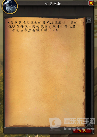 注意:因为戈多罗托会出现在“新兵一日游”支线任务中,因此对于完成“新兵一日游”支线任务的角色,戈多罗托在飞行点西北侧/way 56.49 73.32,对于未完成“新兵一日游”任务线的“偷溜出门”任务的角色,戈多罗托在欧恩伊尔清泉营地内/way 56.76 75.88,虽然位置不同但都可以对话,可能不会影响解密坐骑获取。“新兵一日游”支线任务是养成坐骑—莉姬,雷脊践踏者的前置任务线。