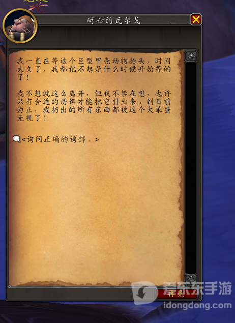 巨壳可汗无法被攻击,询问旁边的海象人耐心的瓦尔戈可以得知需要合适的诱饵才能把它引诱出来。