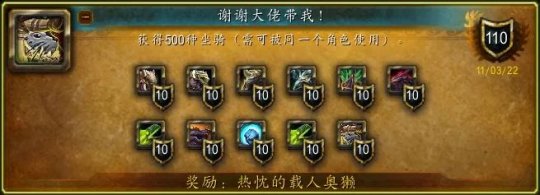 上一个收集400种坐骑成就“蹄声滚滚”还是在争霸艾泽拉斯,在暗影界冒险一番后,想必大家也收集了不少坐骑。当你将第500个坐骑学习后,成就“谢谢大佬带我!”也会随着金光一闪点亮你的成就栏(需可被同一个角色使用),随之而来的就是坐骑热忱的载人奥獭加入你的坐骑栏。