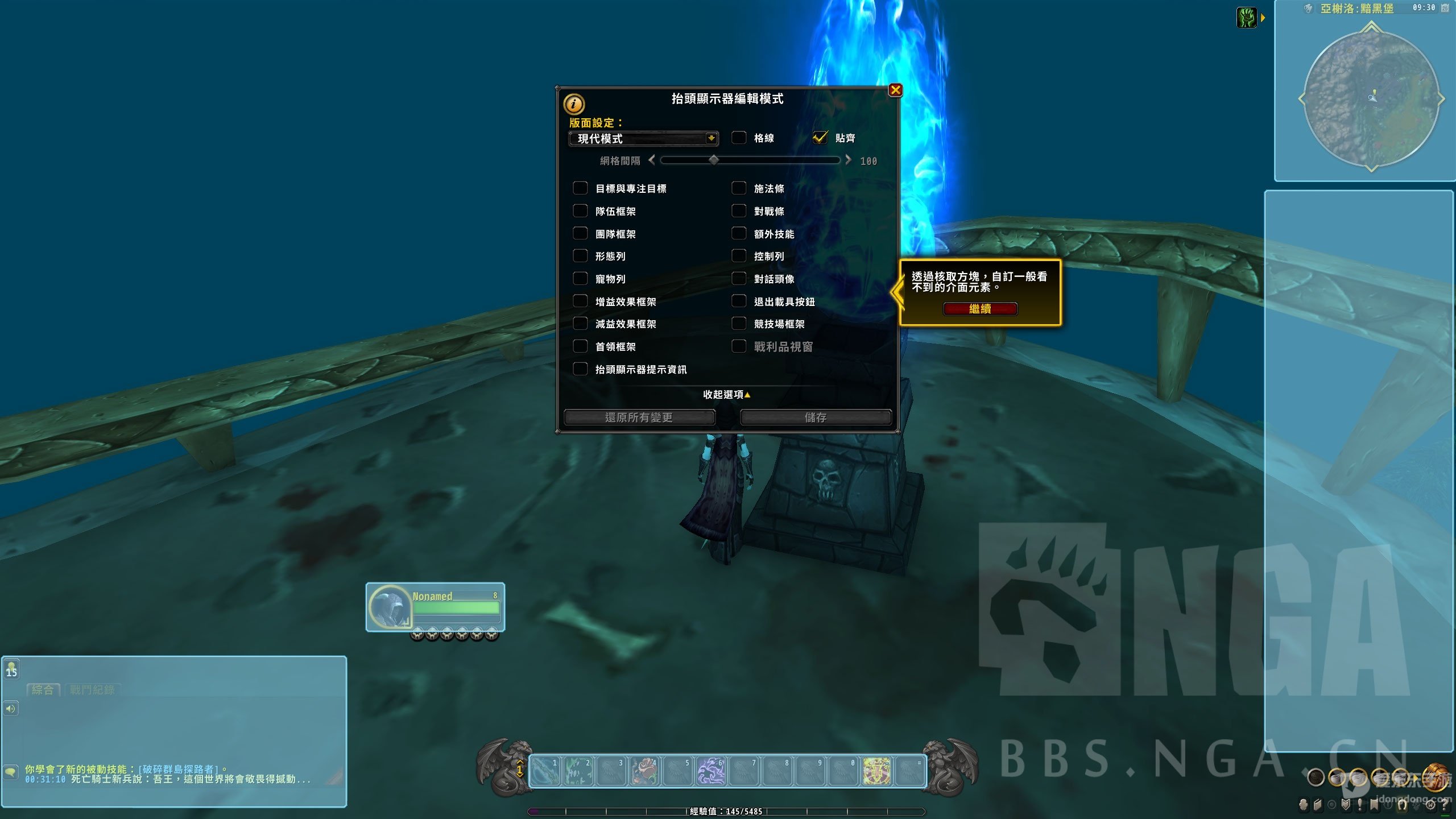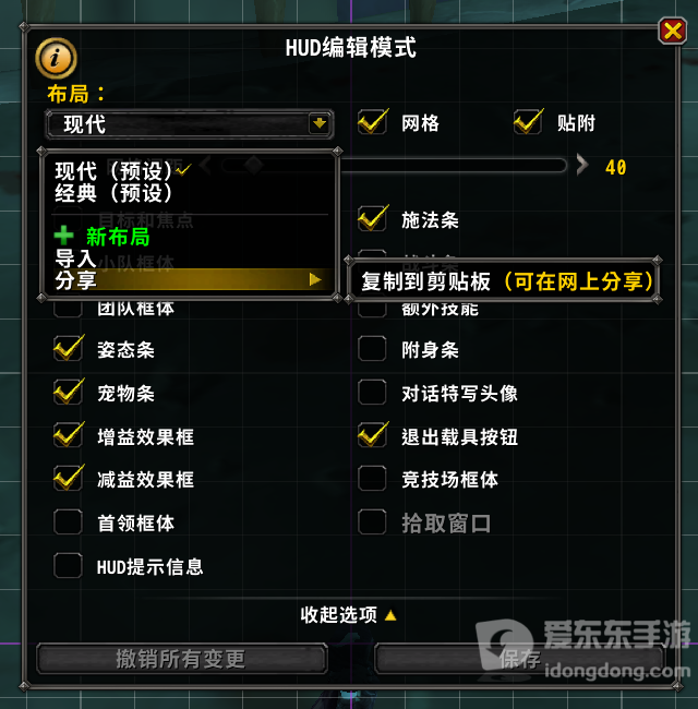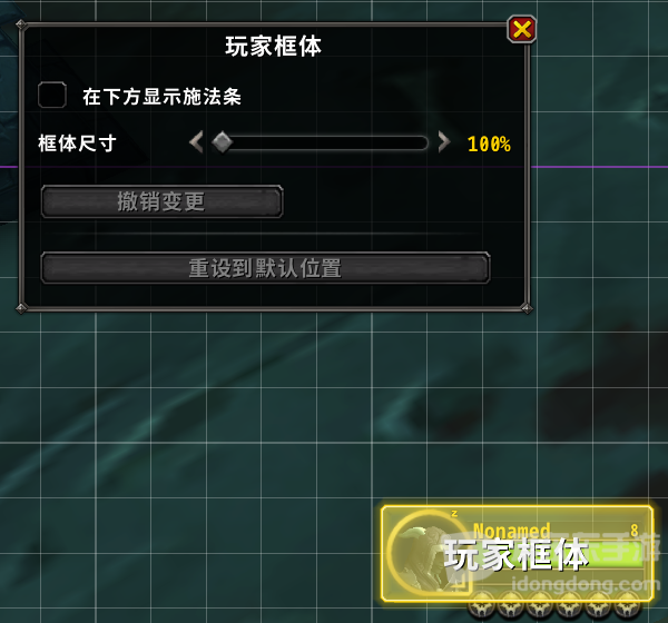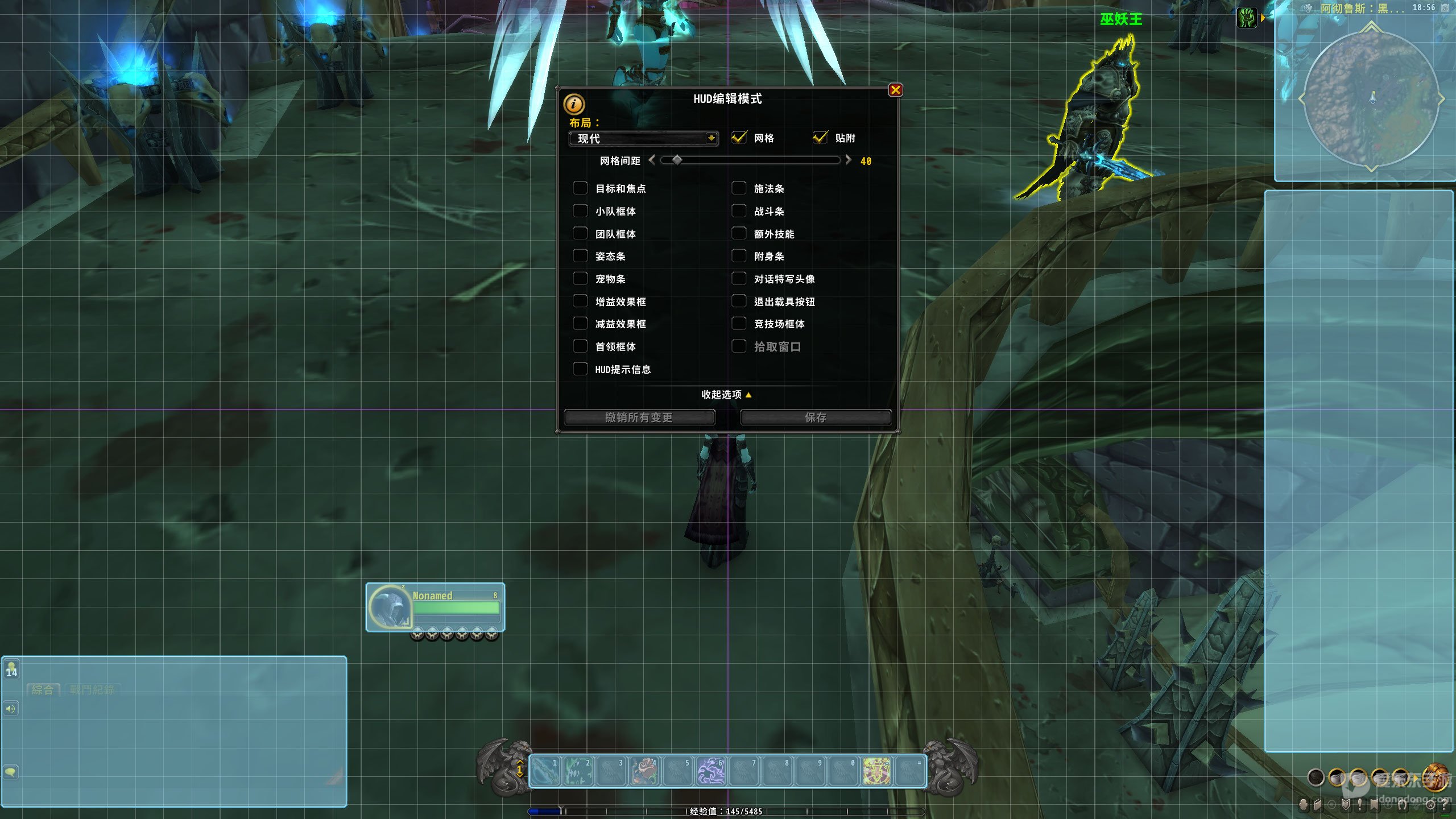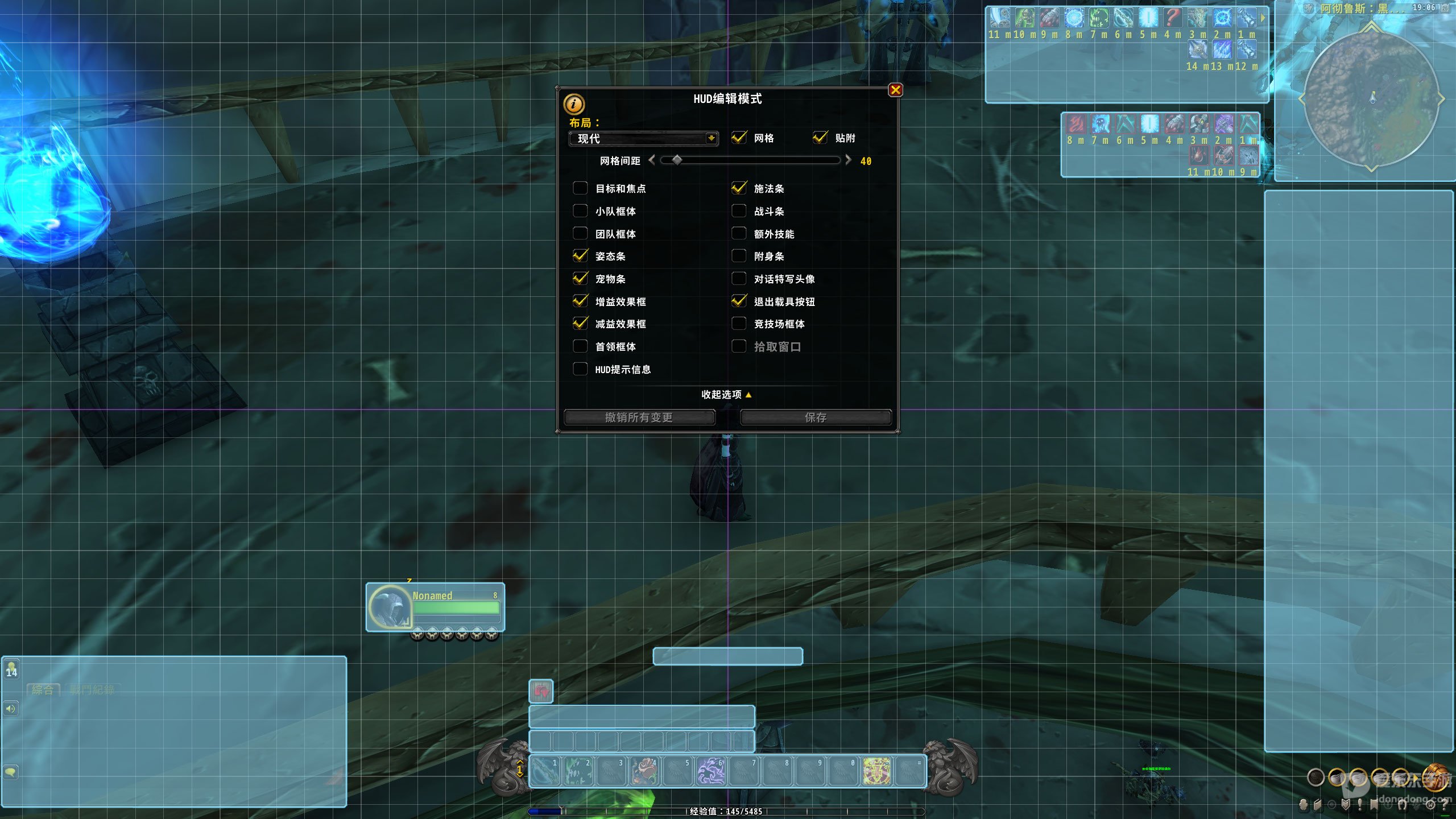 勾选格线,可以开启网格,过去也是玩家自定义介面时常备的插件功能;网格间距越小,网格越密,贴附可以使界面自动贴齐附近的框架或格线。