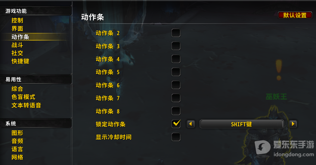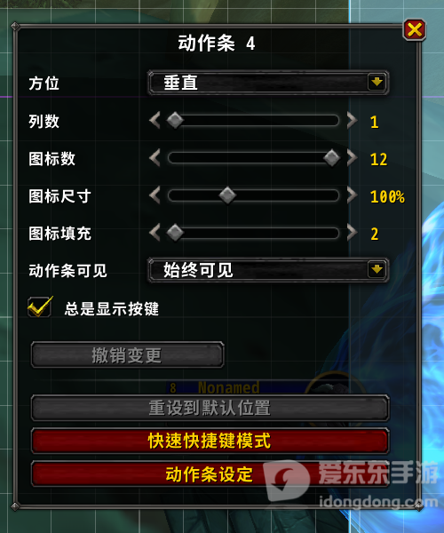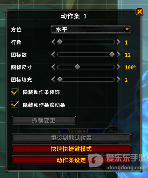 动作条通用的选项可以调整 方向 (排列方式)、列数、图标数 (显示按钮数)、尺寸、填充 (图标之间的间距);动作条 1 可以勾选隐藏装饰 (左右的狮鹫材质) 和滚动条 (翻页按钮),但默认无战斗外隐藏选项;其他动作条 (2~8) 则可以选择显示条件 (如战斗外隐藏)