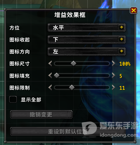 增减益效果框架可以调整 方向 (排列方式)、收起 (垂直增长方向)、方向 (水平增长方向)、尺寸、填充 (图标之间的间距)、限制 (每行图标的个数),勾选 "显示全部" 可以预览增减益效果满栏位的状态。