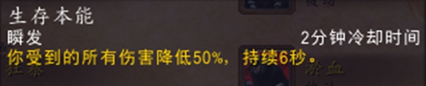 生存本能作为一张底牌通常不安排进常规减伤中,但有必要时也可以开启:6秒50%减伤,CD仅为120秒。