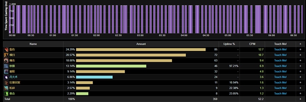 402秒内共施放46次铁鬃、32次重殴,铁鬃按11秒时长计算,不考虑层叠鬃毛的概率获取,则平均覆盖层数为:(46*11)/402=1.26。