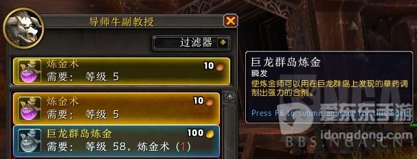 新资料片炼金术命名为“巨龙群岛炼金”,58级以上角色需在任意炼金专业技能训练师学习“经典旧世炼金”1点之后,在巨龙群岛直接学习“巨龙群岛炼金”
