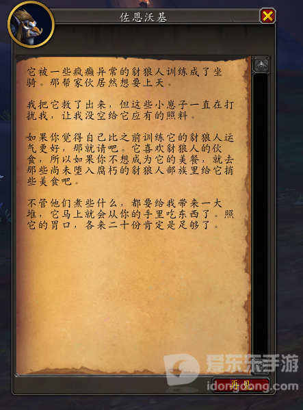 楼主击杀了很多未腐化的豺狼人,目前只发现海象人肉干掉落,其他两种食物来源待补充,但根据法术名称“买下狐龙坐骑”,很可能凑齐这三样食物(每样20份),就可以拿到这只坐骑了。