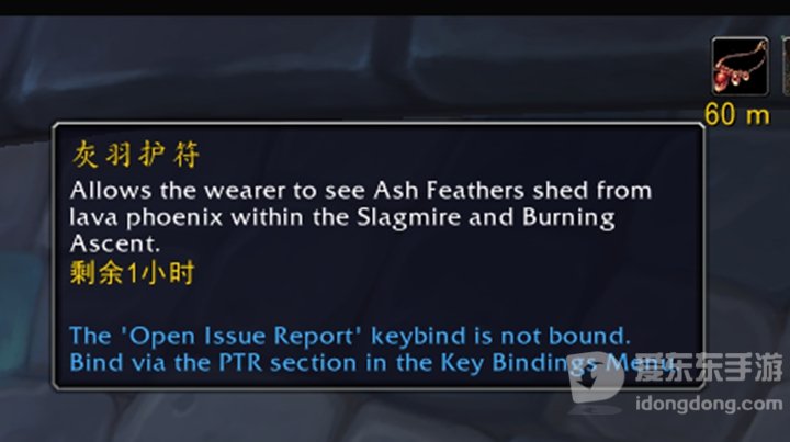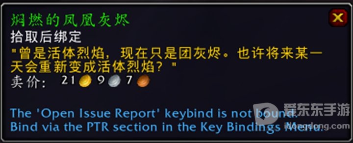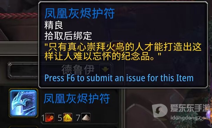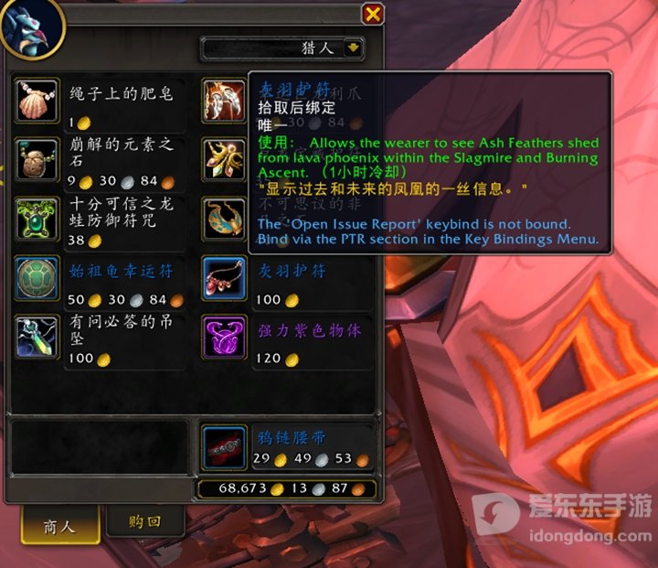 这次他出售一个叫做灰羽护符的物品,一小时冷却cd,使用它可以提供60分钟的Buff,可以允许穿戴者看到熔岩凤凰在岩浆和熔岩之地上脱落的灰烬之羽,物品描述是:"显示过去和未来的凤凰的一丝信息"。