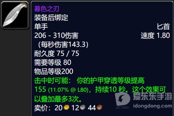 TBC夜色之刃的升级版,小编记得TBC初期夜色之刃一度被数据帝们吹上了天成为仅次于天启的匕首贼极品匕首,后经实战测试大家才发现不过如此纷纷大呼上当受骗。夜色之刃破甲效果还不错,相信暮色之刃也不会差,唯一的问题是刺杀贼破甲收益极低而且1.8的攻速太慢,只能当过渡装备凑合用。