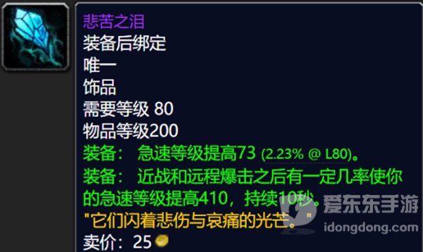 悲苦之泪由风暴峭壁初生的瓦格里小概率掉落(3.3.5数据库显示掉率为0.05%),急速是WLK P1阶段强势职业增强萨、刺杀贼和邪DK第一副属性,个人预测悲苦之泪将是WLK初期最贵装绑。