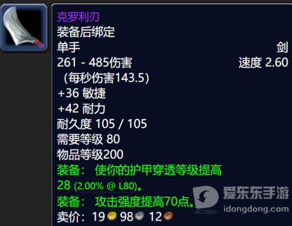 60级近战大菜刀克罗之刃的升级版,2.6的攻速和破甲属性销路更广,冰DK也能用。