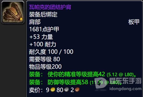 精准在WLK并不是什么稀缺属性,对于版本初期的坦克来说价值还不如命中,瓦帕克的团结护肩唯一优势就是DKT和盾T都能用,销路比较广。