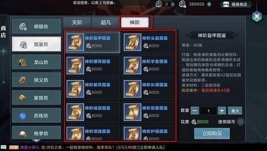40~50级左右的主力装备都是蓝色装备,部分可以通过做任务获得,但是大部分都是要自己通过打星辰塔获取“图鉴坊”装备图纸的购买资格,然后再自己去做任务打材料再合成装备。目前图鉴坊最高可以通过79层星辰塔之后,可以购买89级蓝色套装的所有神阶装备合成图纸。这里可以购买三个等级合成图纸,分别是天阶、超凡和神阶。当然前提条件是,你没有更好的橙色或者紫色武器的话,就去“图鉴坊”买合成图纸。