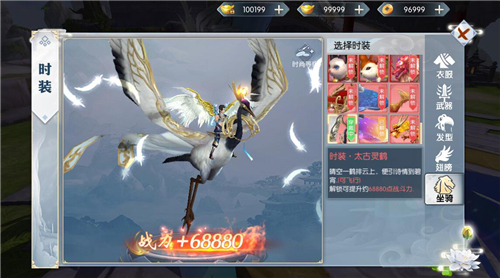 晴空一鹤排云上,便引诗情到碧霄,诗中雅兴在《九州飞凰录》游戏中也体现的淋漓尽致。仙家美景,定要在空中才可以饱览无遗,乘坐【太古灵鹤】便可在仙境中畅游天地。乘骑此坐骑还可直接为战力加成68880,在拥有华丽的飞行特效的同时,尽情的享受空中的美景吧~