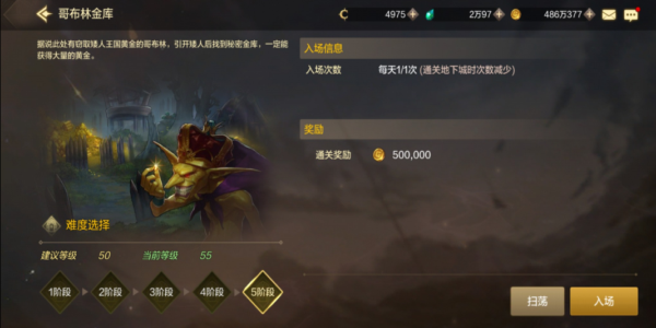 委托任务中的哥布林金库副本,每10级开启一个阶段,共5个阶段,分别对应获得金币为6w、14w、24w、36w、50w。这个副本每天只可以打一次,所以我们要尽快升级,打高阶段的每天必须做。切记不要扫荡,所有委托任务扫荡收益减半。