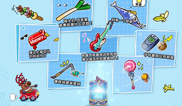 在《元能失控》中有着各种各样神奇的武器和道具。你可能拿着一根造型奇特的葱就开始了战斗,依稀可见上面刻字“骑士们,你手里拿着的是什么武器”;也可能用一根名为“金刚”的香蕉一路射击,不过要小心射击完毕后留下来的香蕉皮;此外还有理论上拿了就可以为所欲为的吐钞枪,用了却会发现有时候钱并不是万能的,实力才是;你还可能发现传说中爷爷辈用来砸核桃的神器“诺基亚”……千奇百怪造型各异的武器伴随着大量的趣味梗,相信玩家们在上手这些武器时都少不了会心一笑。