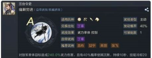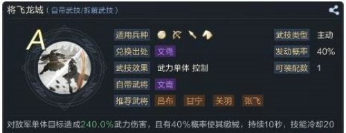 缴械技能,伤害非常高,240%的武力伤害,在主将技降属性之后出发将飞龙城伤害会非常的高,并且也有很大的概率缴械,作为A技能属性是非常不错的,进一步将连击队伍按在地下摩擦。