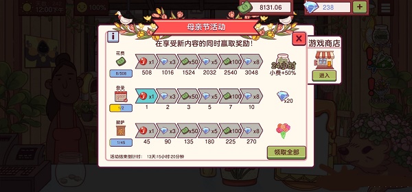更新:一共花了20个游戏日走完了剧情,第18天做完了270个披萨拿到了花束营业,布置好后第19天大胡子妈妈就会来,然后第20天她和大胡子会过来送你花瓶。