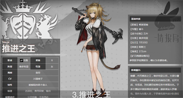 3.推进之王 适合:新人,速通 推进之王如同她代表的狮子一样,简单粗暴。作为最暴力的先锋干员,她的输出能力堪比近卫,重点培养后是队伍里一直都会用上的主力。和银灰一样,只要等级够高就可以随便碾压关卡。