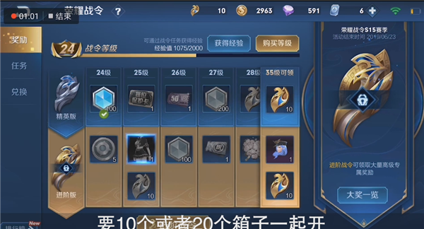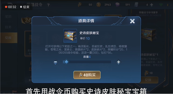 首先用战令币购买史诗皮肤密宝宝箱,然后我们把买到的的箱子分批次打开,可以看到通过一次一次打开只得到了战令经验和英雄碎片,没有抽到皮肤。