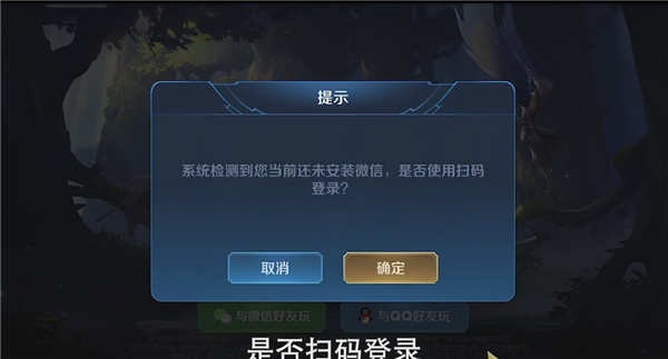 点击选择与微信好友玩,可以看到弹出一个对话框:系统没有检测到微信,是否扫码登录