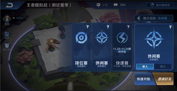 各种赛制都可以选择单人模式或双人模式,双人模式下可邀请队友或自动匹配队友。